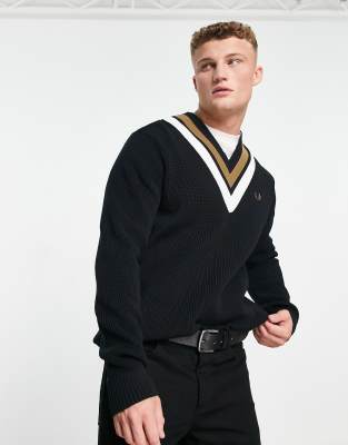 Fred Perry striped v neck jumper in black Very well made.