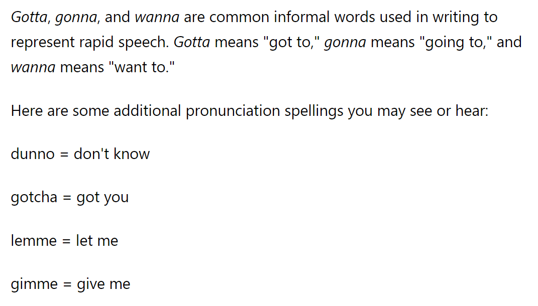Gonna Gotta Wanna Gimme Lemme Slang words Informal Contractions in English Very well made.