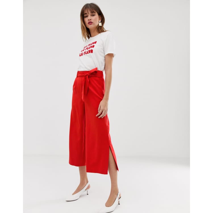 Warehouse wide leg cropped trousers with tie belt in red ASOS Very well made.