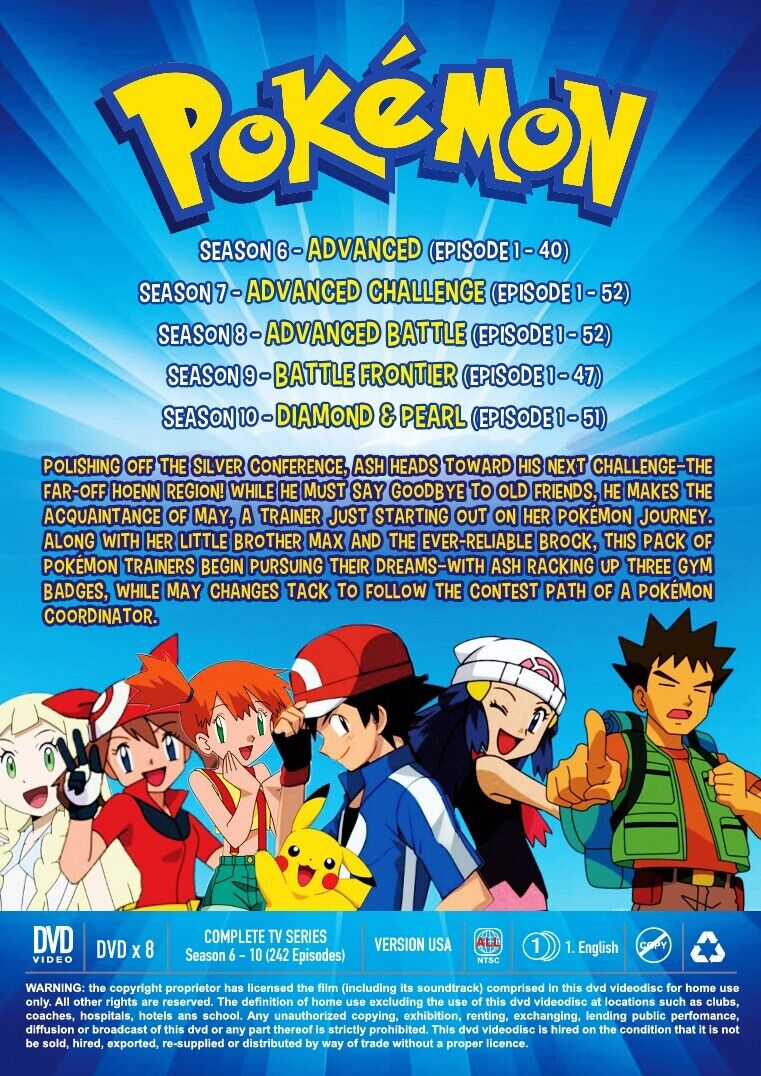Pokemon Season 6 10 Advanced Advanced Challenge Advanced Battle Battle Frontier Diamond Pearl 242 Episodes Japanese Anime DVD USA Version English Dubbed Region All DiscPlayercdndvd Very well made.