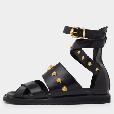 Pre owned Versace Black Leather Medusa Gladiator Flat Sandals Size Very well made.
