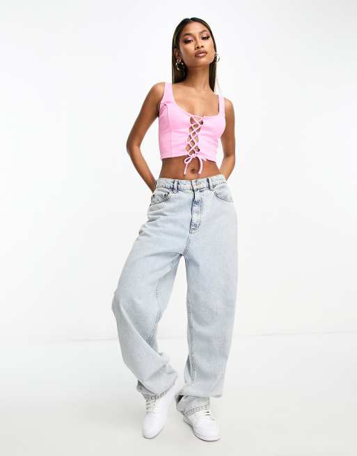 ASOS DESIGN lace up front ribbed corset top in pink ASOS Very well made.