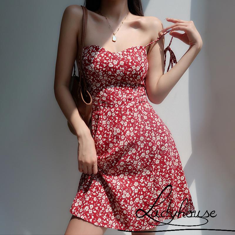 LDD Women Sling Dress Spaghetti Straps Lacing Backless Floral Very well made.