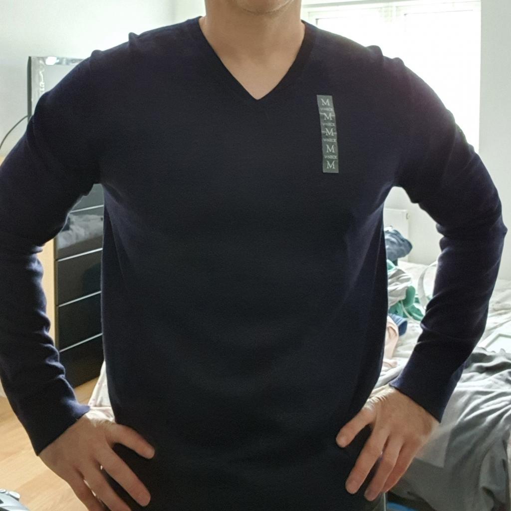 LINEA Jumper Size Medium Men Blue Luxury Merino Wool V Neck Long Very well made.