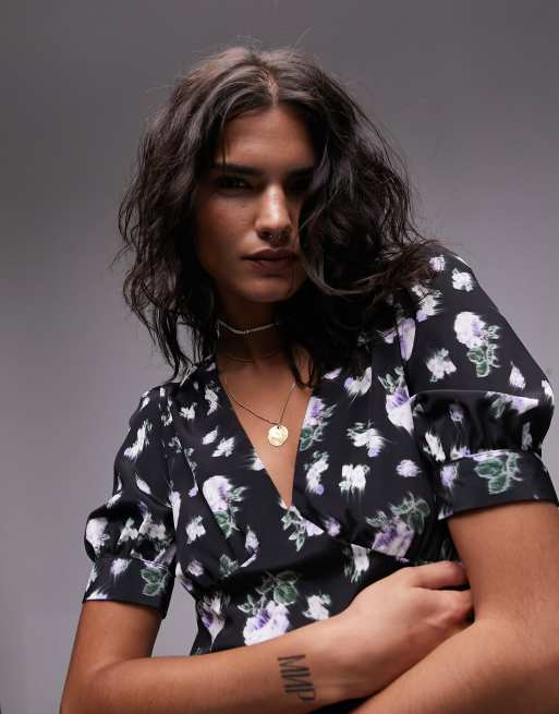 Topshop Bella v neck mini tea dress in blurred floral print Very well made.